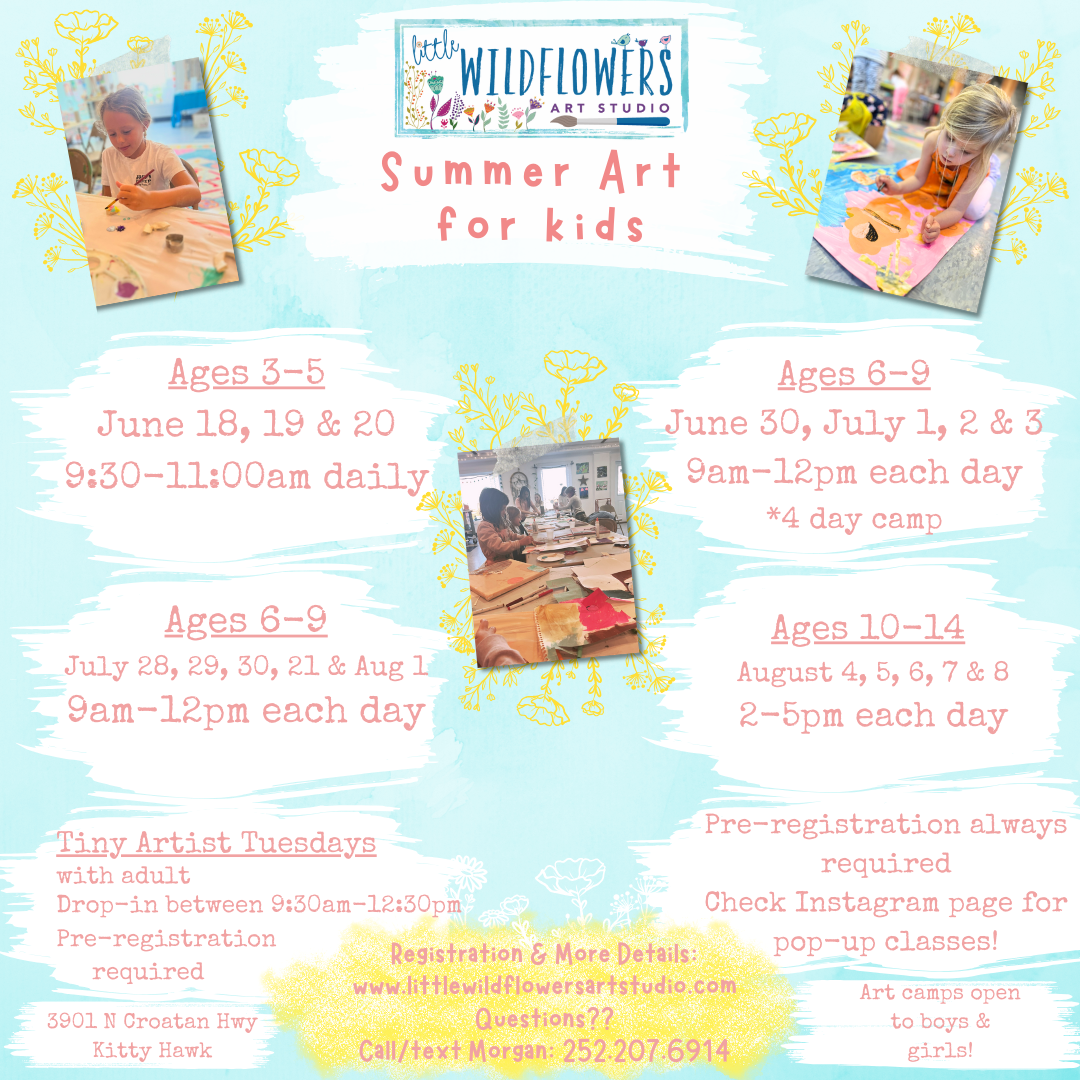 A grown-up MUST join and help to watch your tiny artist(s)! There will be small items, paints, messy supplies that could go into mouths. Little Wildflowers staff will be there to assist with the craft stations, but we can't keep a perfect eye on each tiny artist.